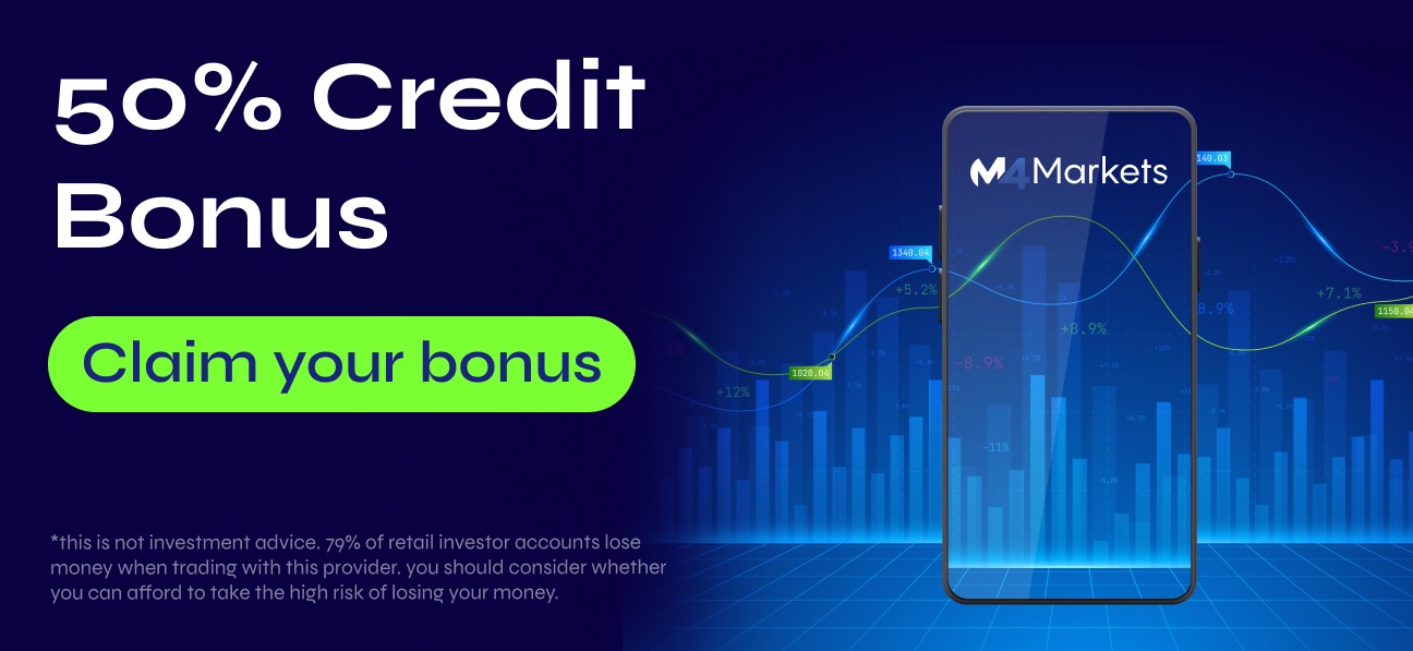 M4Markets の認証済みライブ口座に入金するたびに、取引のパワーを強化できます。50% のクレジットボーナスを獲得しましょう!
